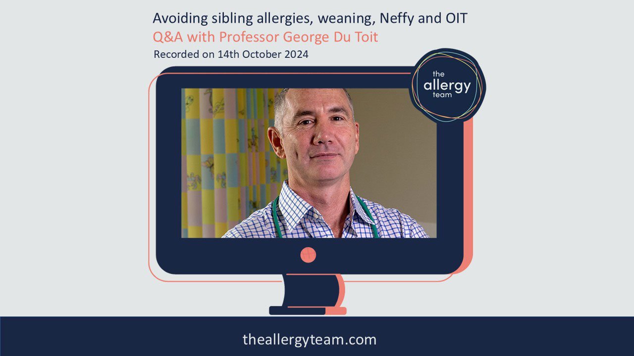 In this Q&A Professor George du Toit discusses outgrowing allergies, how to wean your child if you have allergies, whether mothers can do anything to prevent unborn siblings developing allergies and whether skin prick tests or blood tests are best at diagnosing allergies. He also answered lots of questions about oral immunotherapy treatment, because he’s at the forefront of research into peanut OIT and he gave us his take on Neffy, the needle-free alternative to adrenaline pens which has just become available in the US.
